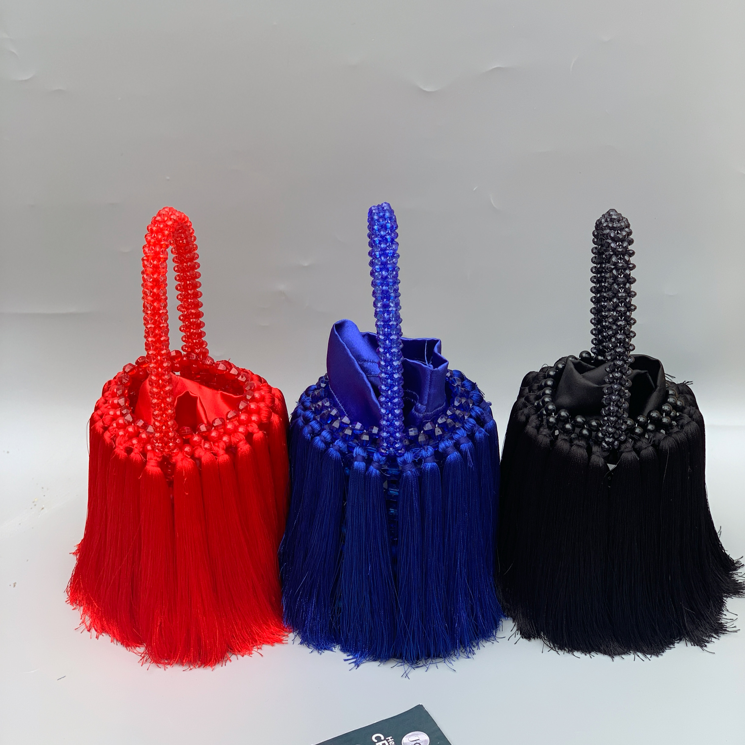 The bag features an intricately beaded handle that adds texture and sophistication, while the main body is adorned with long flowing tassels that create graceful movement with every step. The result is a handbag that feels both luxurious and lively—perfect for making a stylish impression.